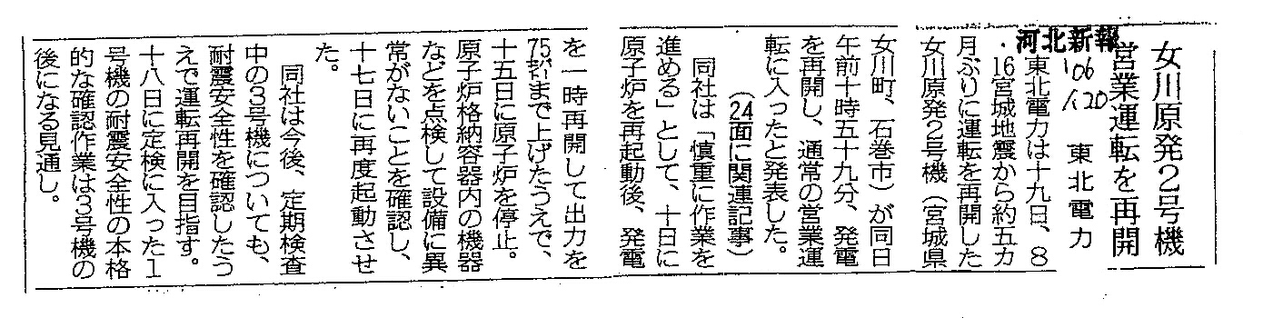 [2006_01_20_01]女川原発2号機 営業運転を再開 東北電力(河北新報2006年1月20日)