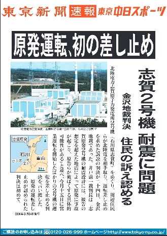 北陸電力志賀原子力発電所2号機(石川県志賀町)をめぐり、周辺住民らが北陸電を相手取り、運転差し止めを求めた訴訟の判決が24日、金沢地裁であった。井戸謙一裁判長は「志賀原発2号機の耐震設計には、被告の想定を超えた地震によって原発に事故が起こり、原告らが被ばくする具体的可能性がある」と述べ、今月15日に営業運転を開始したばかりの2号機の運転を差し止める判決を言い渡した。 原発の運転差し止めが認められた判決は初めて。 |