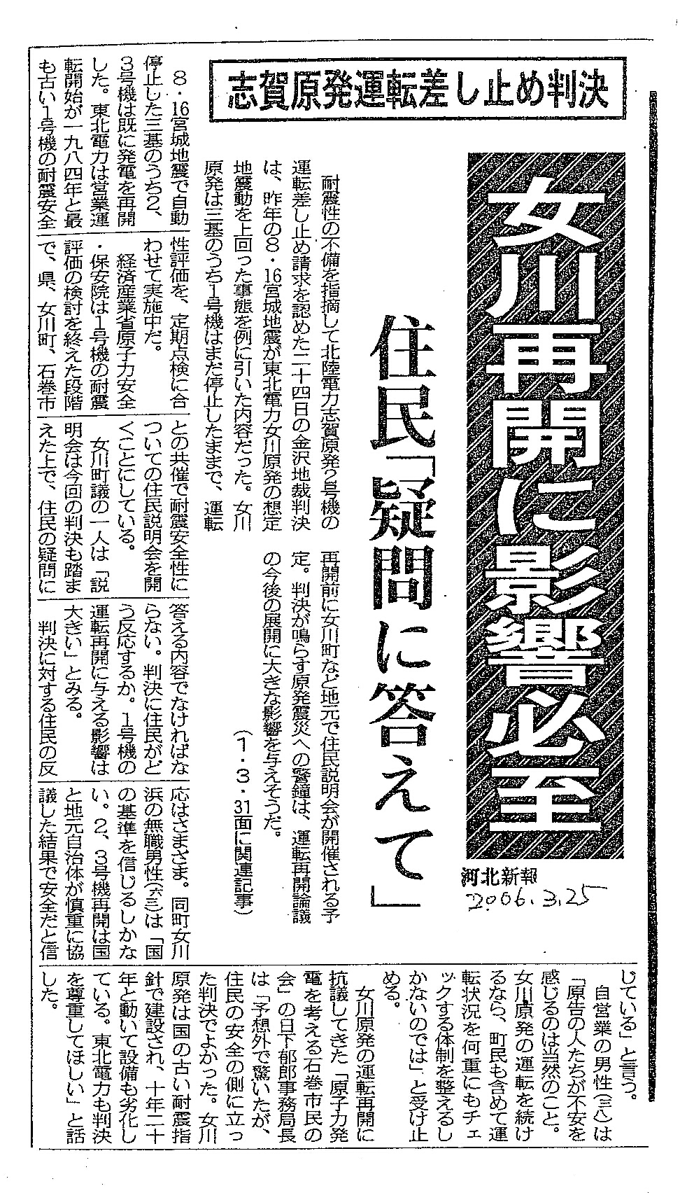 [2006_03_25_02]志賀原発運転差し止め判決 女川再開に影響必至 住民「疑問に答えて」(河北新報2006年3月25日)