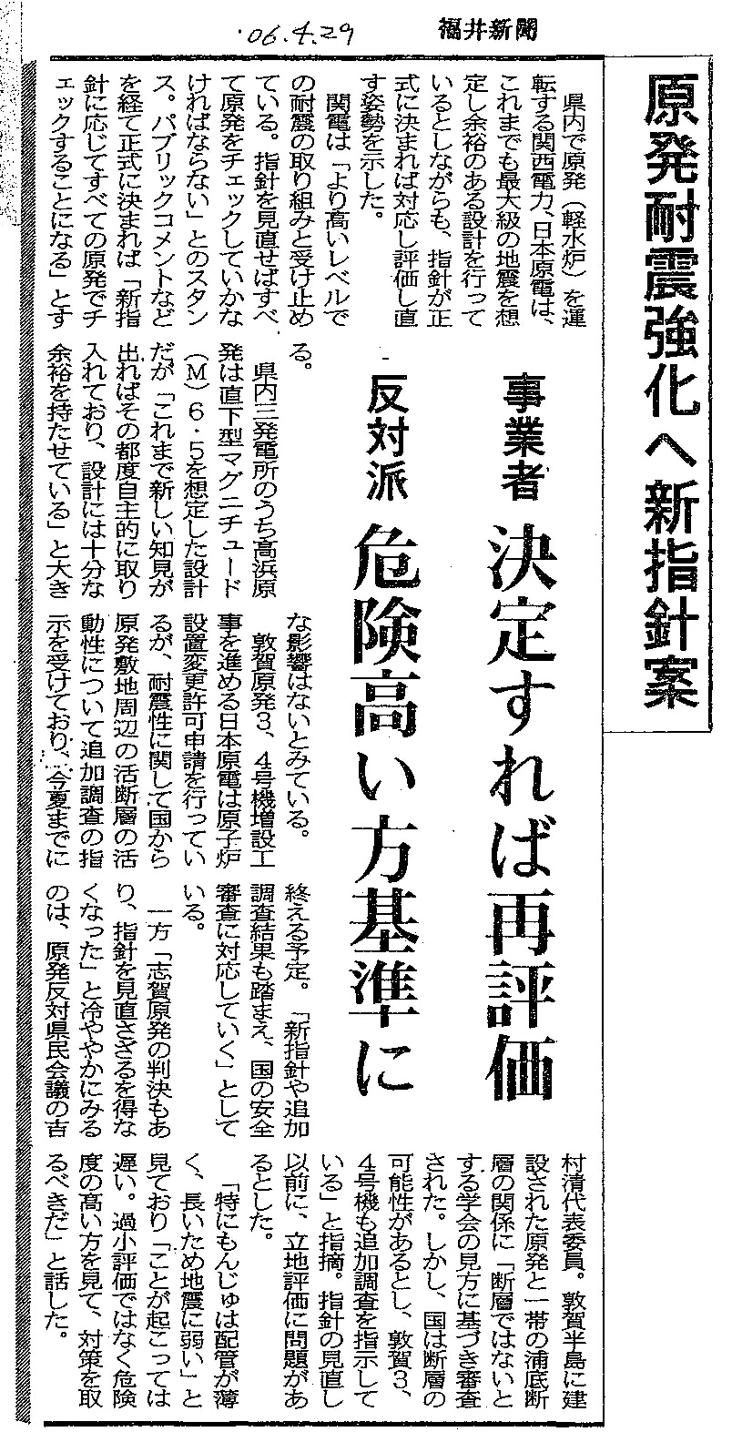 [2006_04_29_02]原発耐震強化へ新指針案 事業者 決定すれば再評価 反対派 危険高い方基準(福井新聞2006年4月29日)