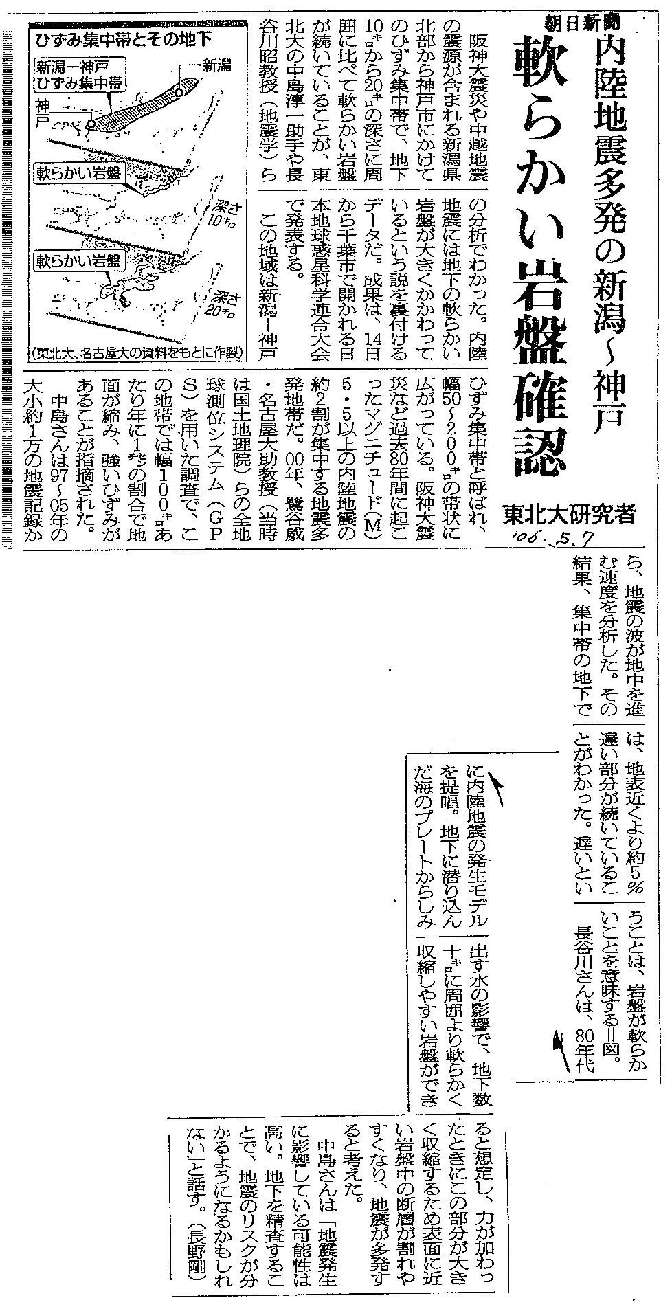 [2006_05_07_02]内陸地震多発の新潟〜神戸 軟らかい岩盤確認 東北大研究者(朝日新聞2006年5月7日)