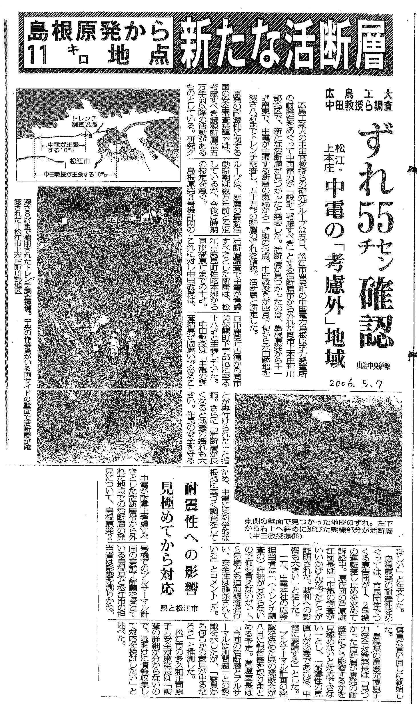 [2006_05_07_03]島根原発から11キロ地点 新たな活断層 広島工大 中田教授ら調査 ずれ55センチ確認 松江・上本庄 中電の「考慮外」地域 耐震性への影響見極めてから対応 県と松江市(山陰中央新報2006年5月7日)