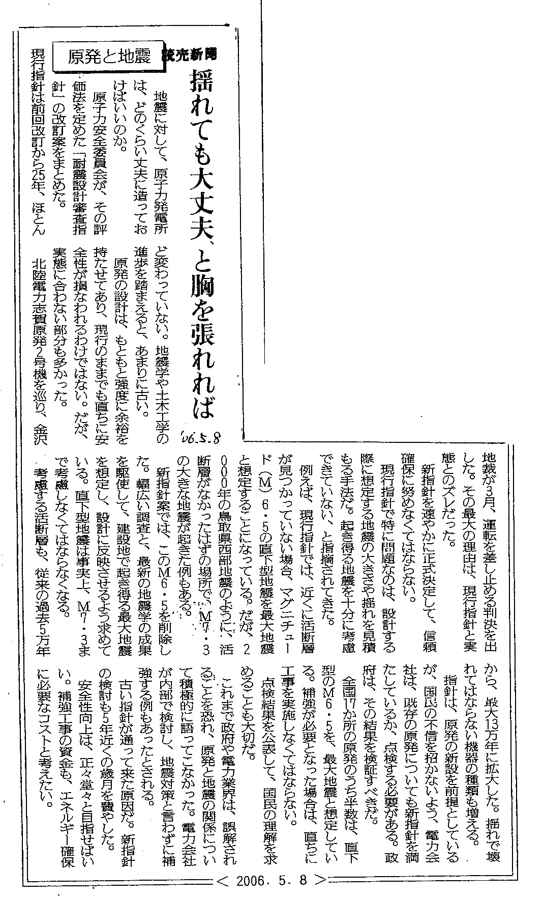 [2006_05_08_01]原発と地震 揺れても大丈夫、と胸を張れれば(読売新聞2006年5月8日)