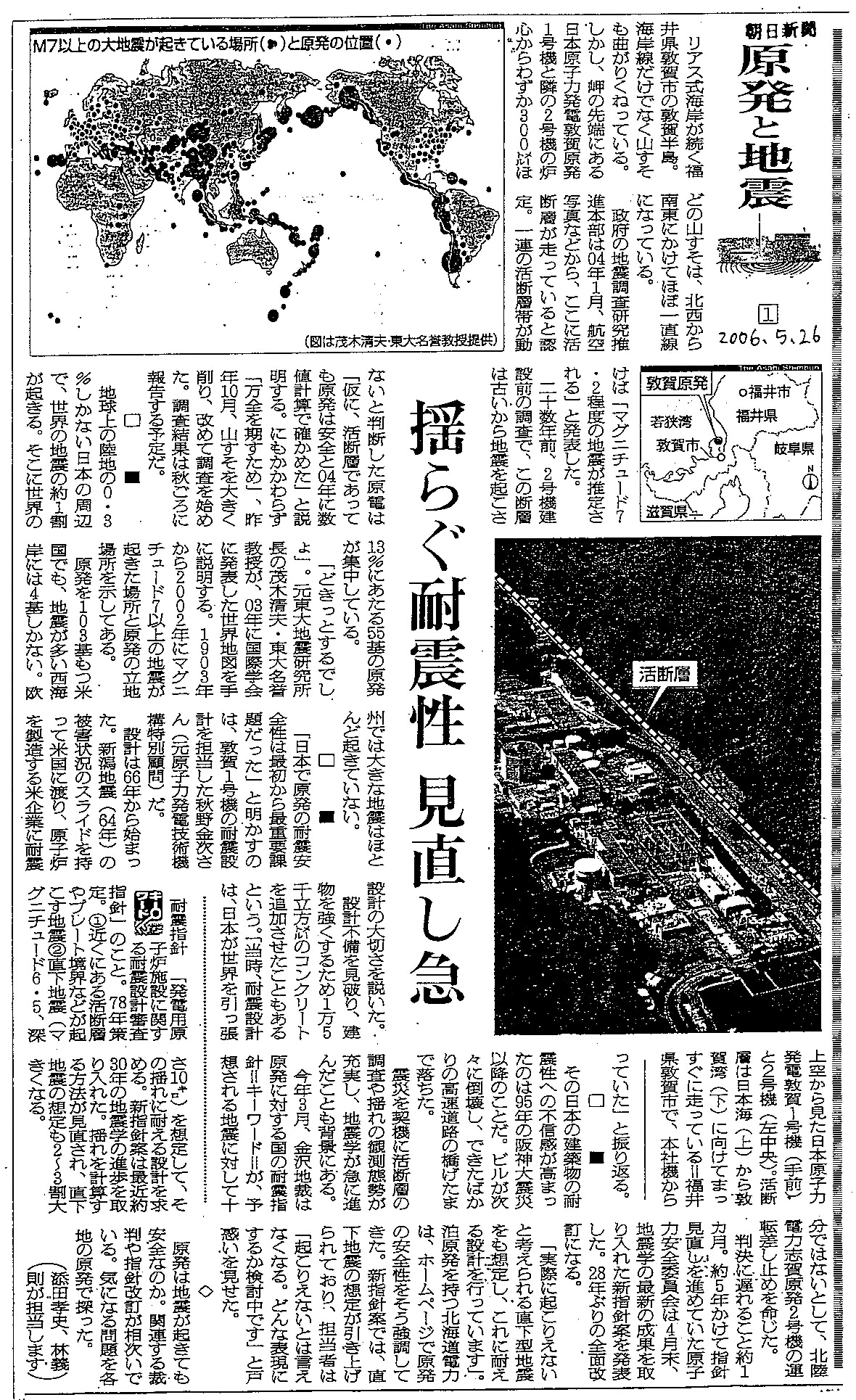 | [2006_05_26_01]原発と地震 揺らぐ耐震性 見直し急 耐震指針(朝日新聞2006年5月26日) |