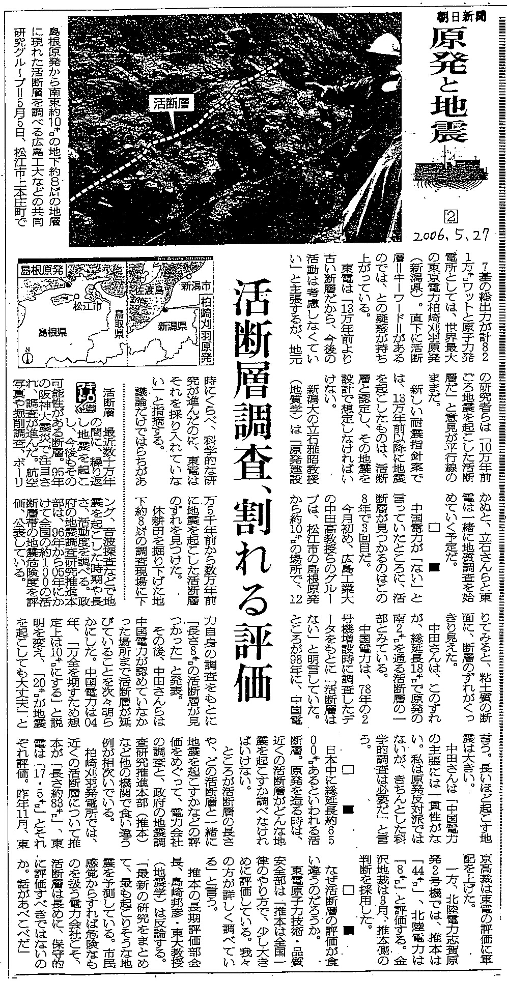 | [2006_05_27_01]原発と地震 活断層調査、割れる評価(朝日新聞2006年5月27日) |