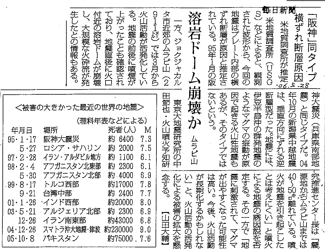 [2006_05_28_01]「阪神」同タイプ 横ずれ断層原因 米地質調査所が推定 溶岩ドーム崩壊か ムラピ山(毎日新聞2006年5月28日)