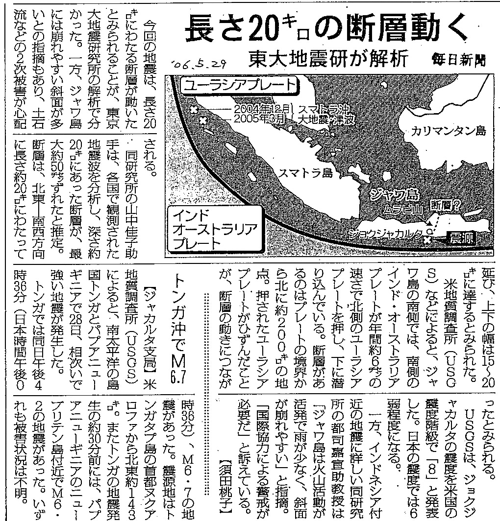 [2006_05_29_01]長さ20キロの断層動く 東大地震研が解析 トンガ沖でM6.7(毎日新聞2006年5月29日)