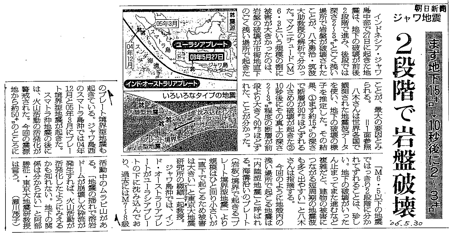 [2006_05_30_01]ジャワ地震 まず地下15キロー>10秒後に2〜3キロ 2段階で岩盤破壊(朝日新聞2006年5月30日)