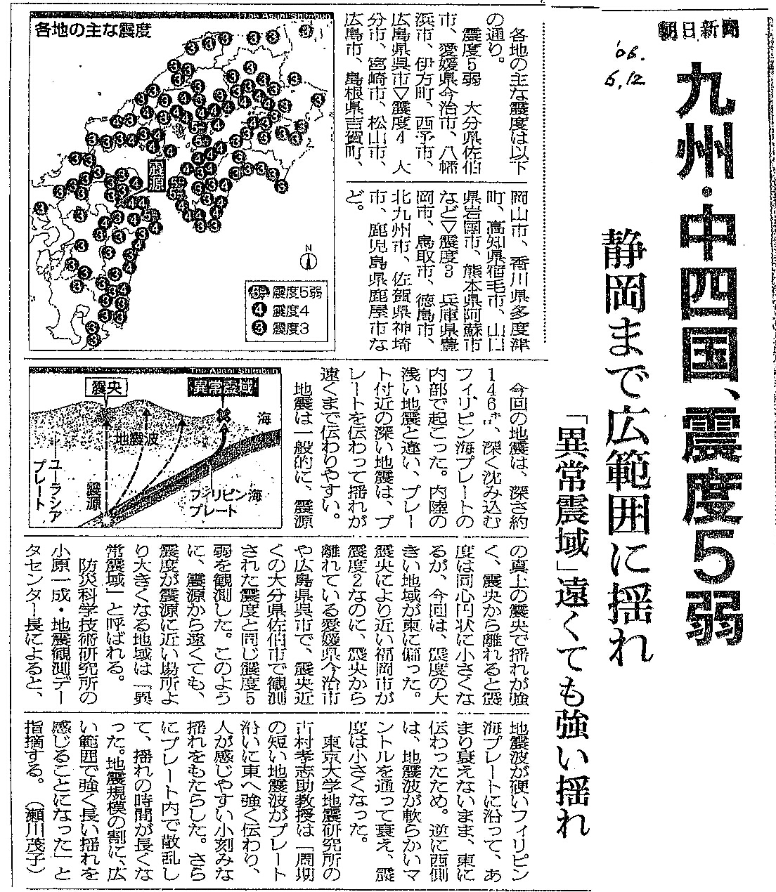 | [2006_06_12_02]九州・中四国、震度5弱 静岡まで広範囲に揺れ 「異常震域」遠くても強い揺れ(朝日新聞2006年6月12日) |