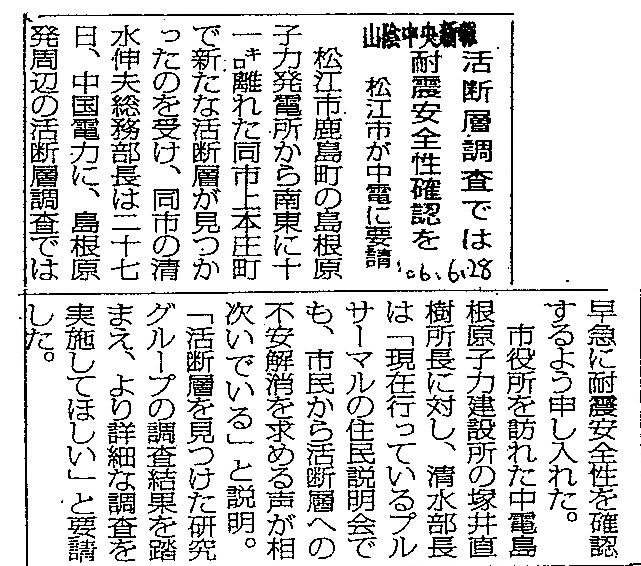 [2006_06_28_01]活断層調査では耐震安全性確認を 松江市が中電に要請(山陰中央新報2006年6月28日)
