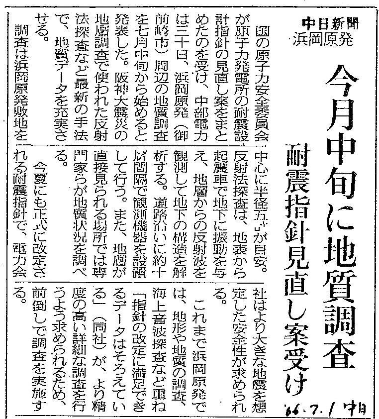 [2006_07_01_02]浜岡原発 今月下旬に地質調査 耐震指針見直し案受け(中日新聞2006年7月1日)
