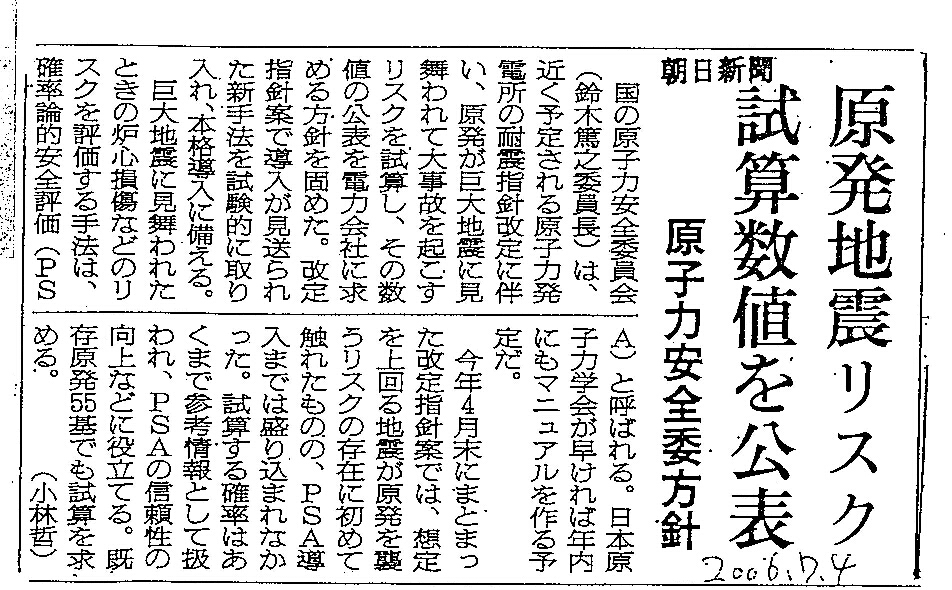 [2006_07_04_01]原発地震リスク 試算数値を公表 原子力安全委方針(朝日新聞2006年7月4日)