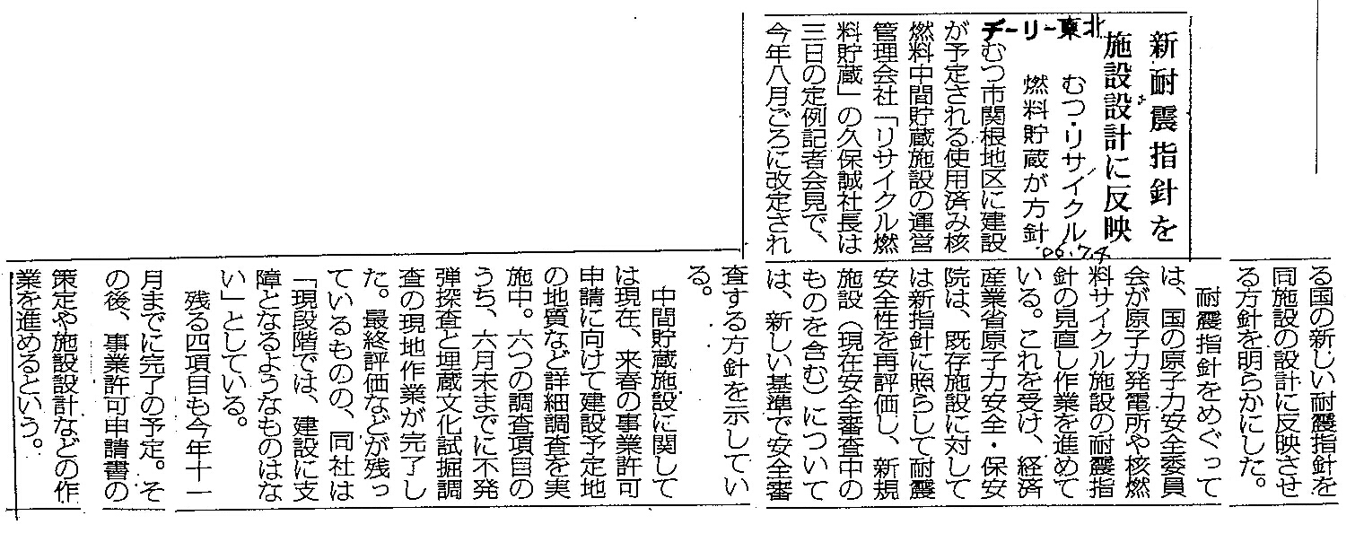 | [2006_07_04_02]新耐震指針を施設設計に反映 むつ・リサイクル燃料貯蔵が方針(デーリー東北2006年7月4日) |