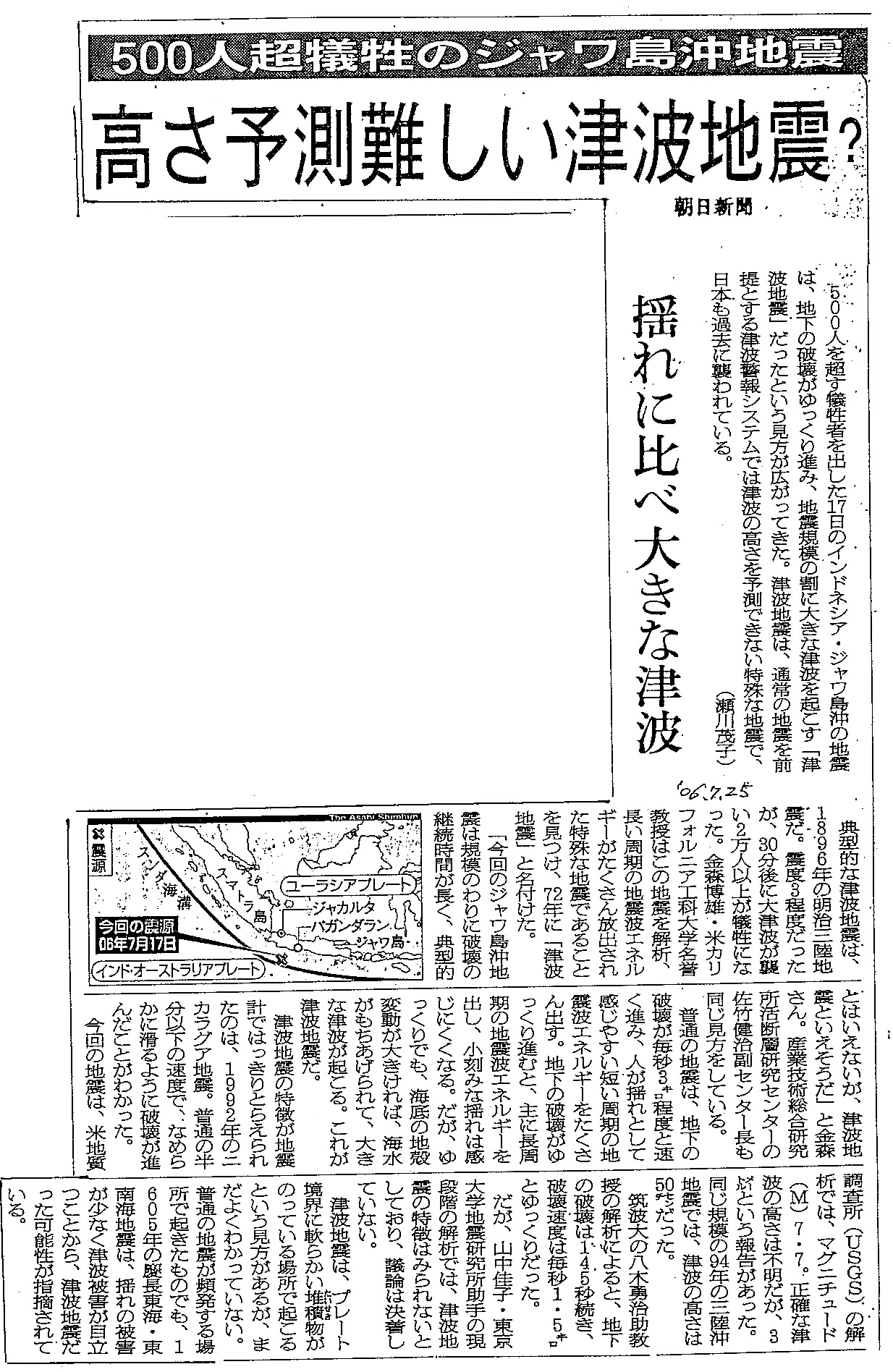 | [2006_07_25_01]500人超犠牲のジャワ島沖地震 高さ予測難しい津波地震? 揺れに比べ大きな津波(朝日新聞2006年7月25日) |
