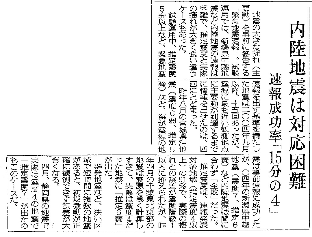 [2006_07_31_01]内陸地震は対応困難 速報成功率「15分の4」(茨城新聞2006年7月31日)