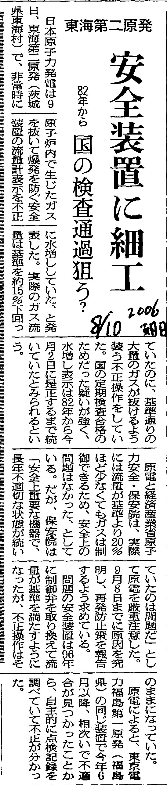 [2006_08_10_01]東海第二原発 安全装置に細工 82年から 国の検査通過狙う?(朝日新聞2006年8月10日)