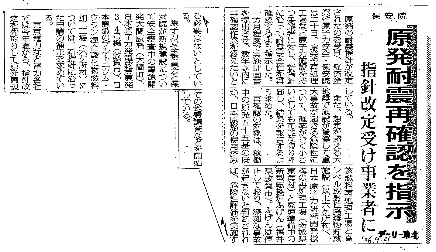 | [2006_09_21_01]保安院 原発耐震再確認を指示 指針改定受け事業者に(デーリー東北2006年9月21日) |