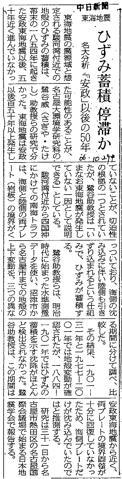 [2006_10_29_01]東海地震 ひずみ蓄積 停滞か 名大分析 「安政」以後の50年(中日新聞2006年10月29日)