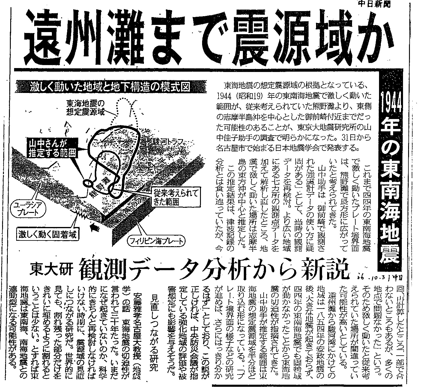 [2006_10_31_01]遠州灘まで震源域か 1944年の東南海地震 東大研 観測データ分析から新設 見直しつながる研究 安藤雅孝名古屋大教授(地震学)(中日新聞2006年10月31日)