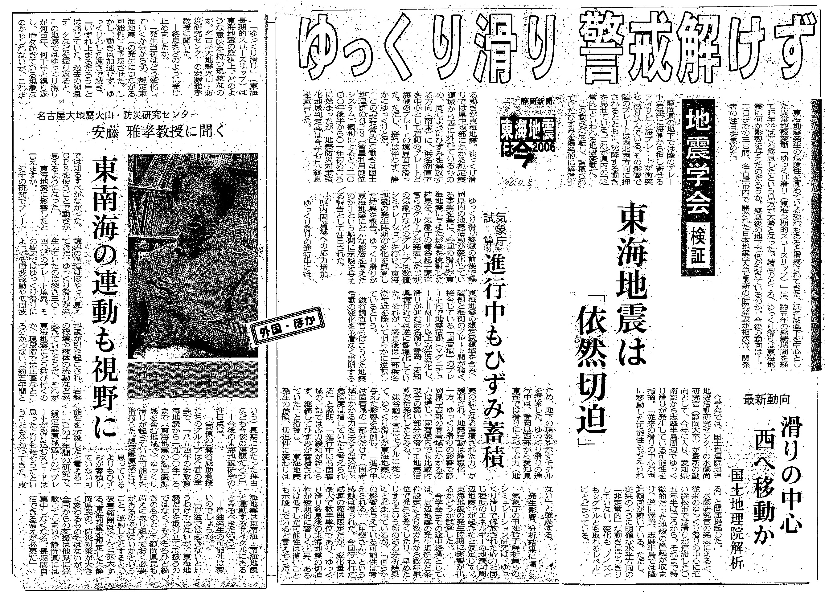 | [2006_11_05_01]ゆっくり滑り 警戒解けず 地震学会検証 東海地震は今2006 東海地震は「依然切迫」 最新動向 滑りの中心 西へ移動か 国土地理院解析 気象庁試算 進行中もひずみ蓄積 名古屋大地震火山・防災研究センター 安藤雅孝教授に聞く 東南海の連動も視野に(静岡新聞2006年11月5日) |
