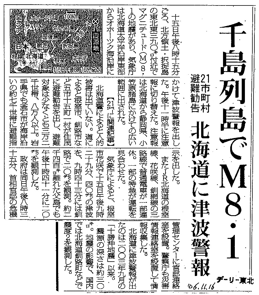 | [2006_11_16_01]千島列島でM8.1 21市町村避難勧告 北海道に津波警報(デーリー東北2006年11月16日) |