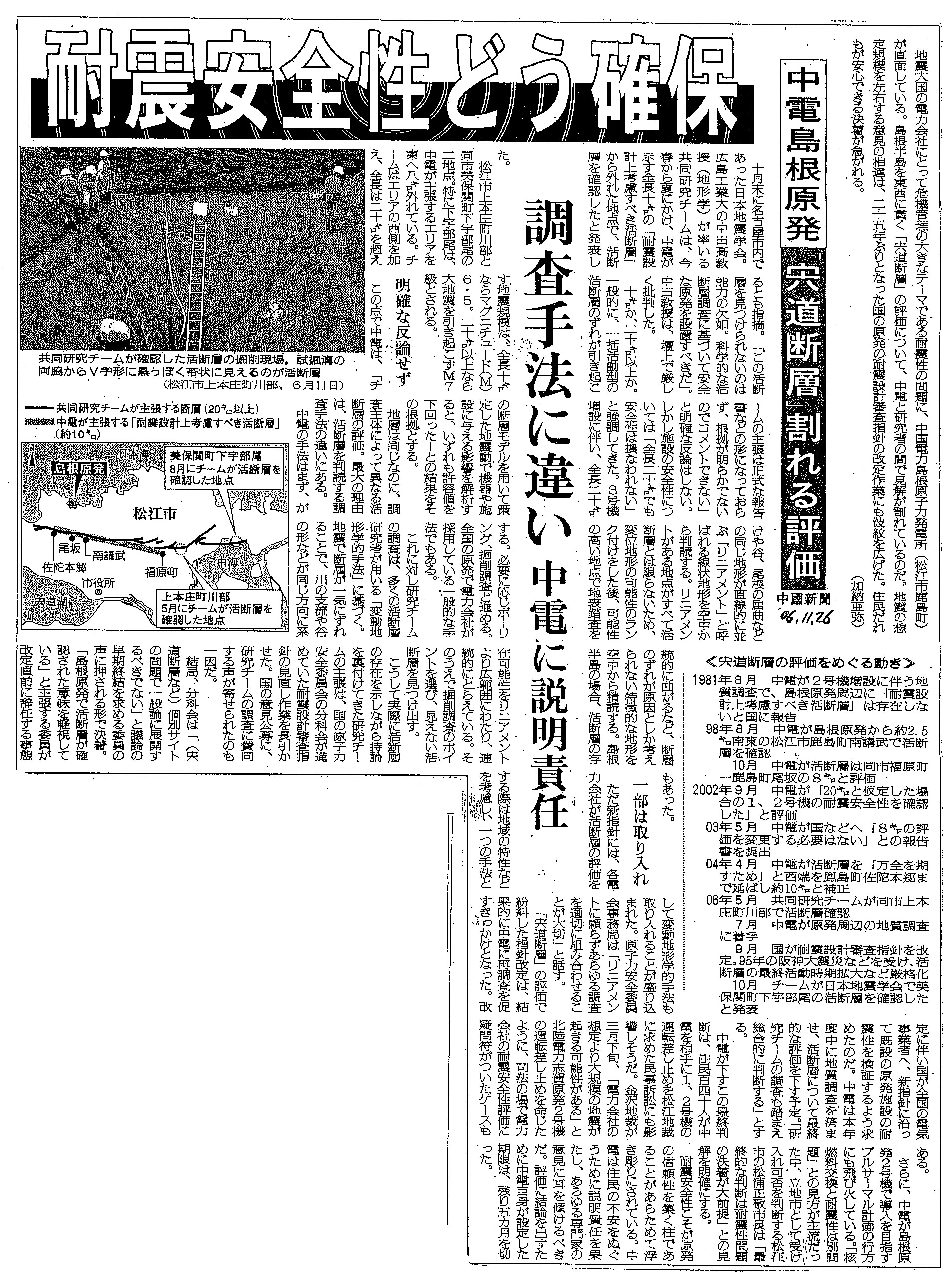 [2006_11_26_01]耐震安全性どう確保 中電島根原発 「宍道断層」割れる評価 調査手法に違い 中電に説明責任(中国新聞2006年11月26日)