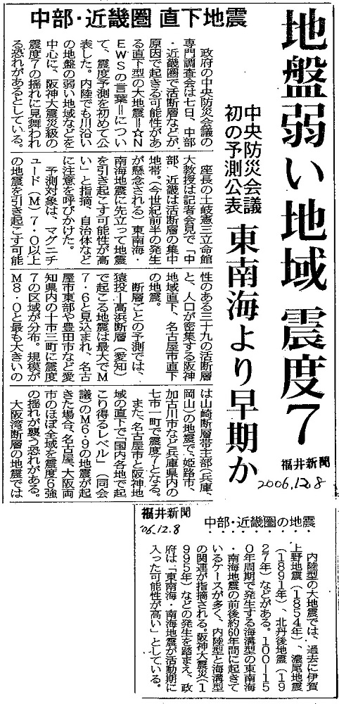 | [2006_12_08_01]中部・近畿圏 直下地震 地盤弱い地域 震度7 中央防災会議 初の予測公表 東南海より早期か 中部・近畿圏の地震(福井新聞2006年12月8日) |