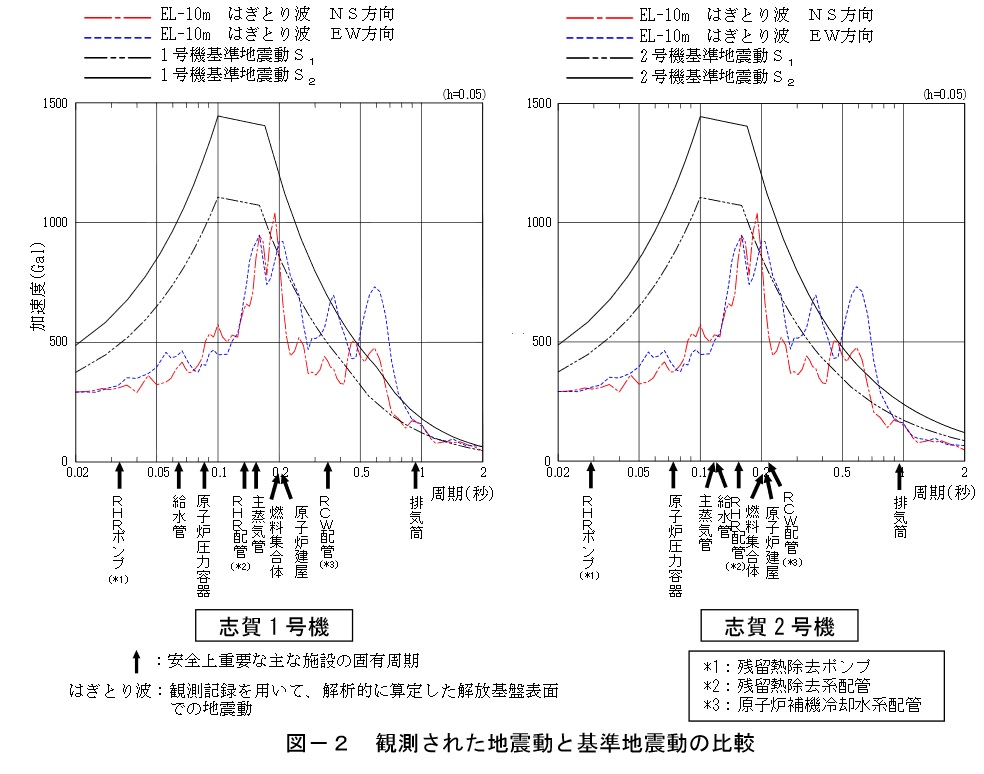 | [2007_04_19_04]「能登半島地震を踏まえた志賀原子力発電所の耐震安全性確認に係る報告について」より「図ー2 観測された地震動と基準地震動の比較」を抜粋(北陸電力2007年4月19日) |