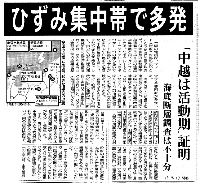 [2007_07_17_01]ひずみ集中帯で多発 「中越は活動期」証明 海底断層調査は不十分(毎日新聞2007年7月17日)