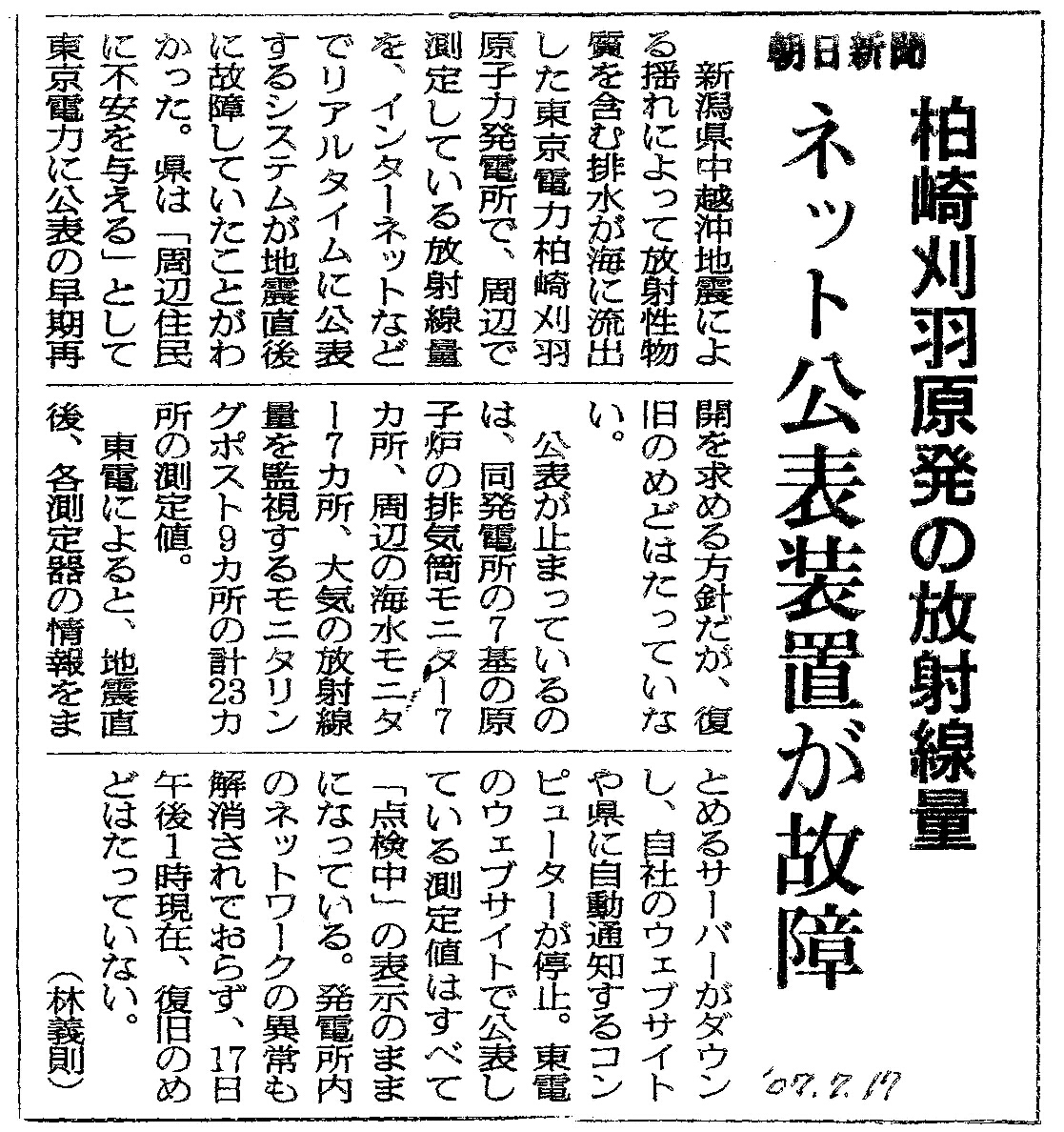 | [2007_07_17_02]柏崎刈羽原発の放射線量 ネット公表装置が故障(朝日新聞2007年7月17日) |