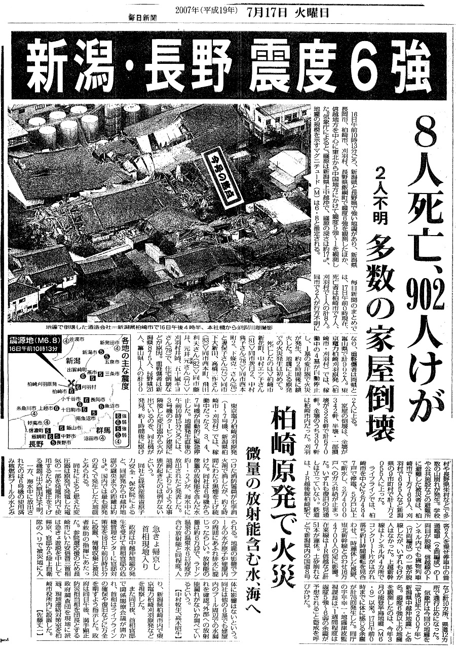 | [2007_07_17_03]新潟・長野 震度6強 8人死亡、902人けが 2人不明 多数の家屋倒壊 柏崎原発で火災 微量の放射能含む水、海へ(毎日新聞2007年7月17日) |