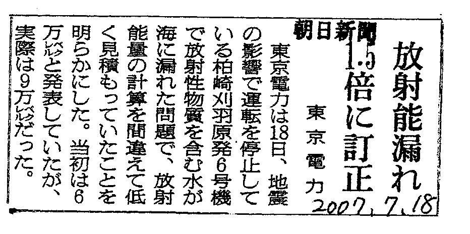 [2007_07_18_02]放射能漏れ1.5倍に修正 東京電力(朝日新聞2007年7月18日)