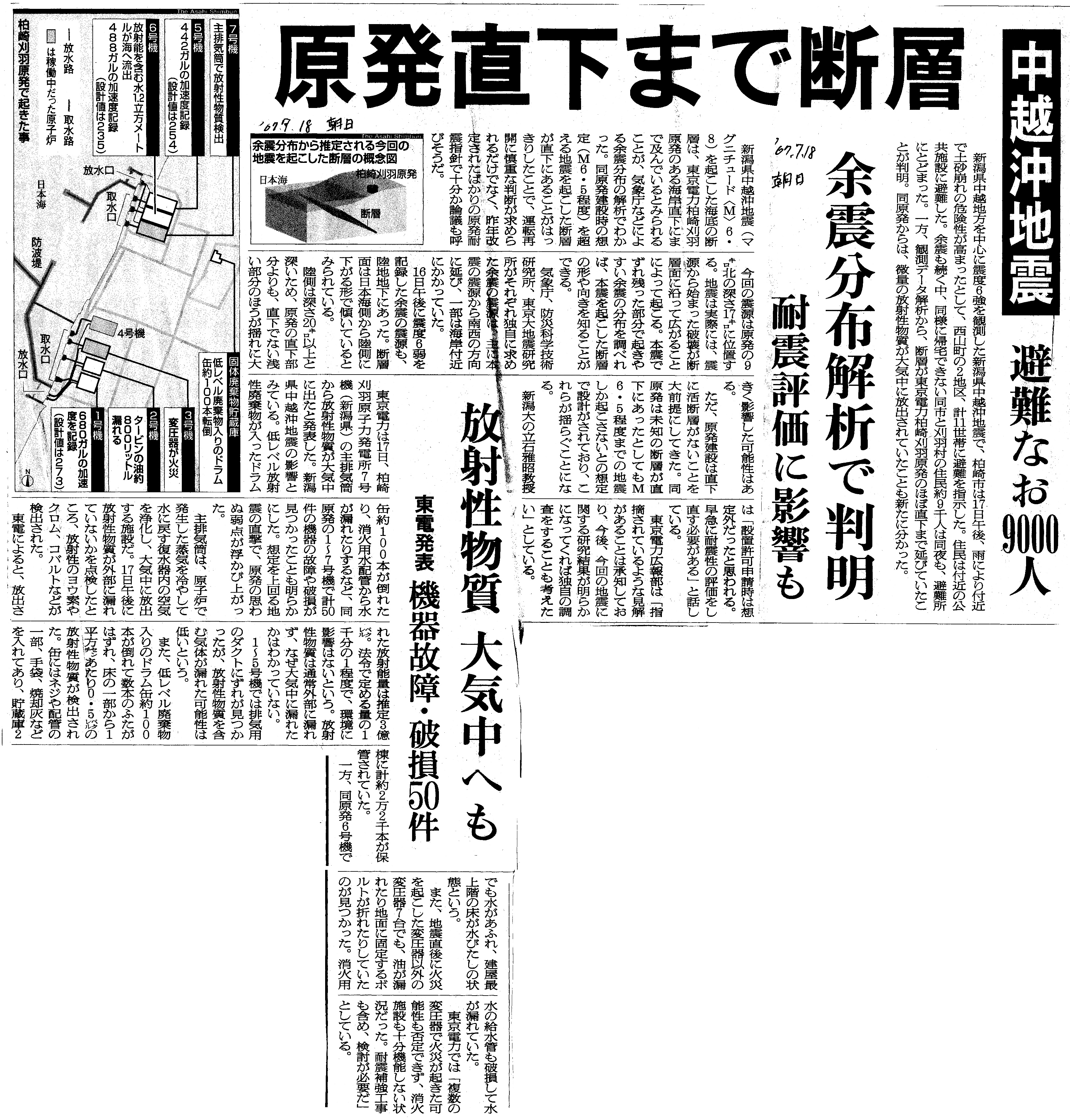 | [2007_07_18_04]原発直下まで断層 中越沖地震 避難なお9000人 余震分布解析で判明 耐震評価に影響も 放射性物質 大気中へも 東電発表 機器故障・破損50件(朝日新聞2007年7月18日) |