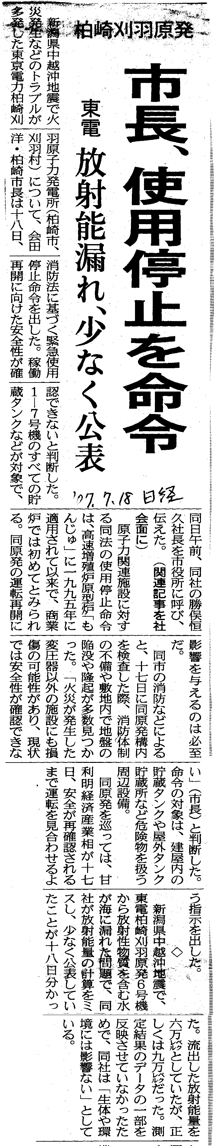 | [2007_07_18_05]柏崎刈羽原発 市長、使用停止を命令 東電 放射能漏れ、少なく公表(日経新聞2007年7月18日) |