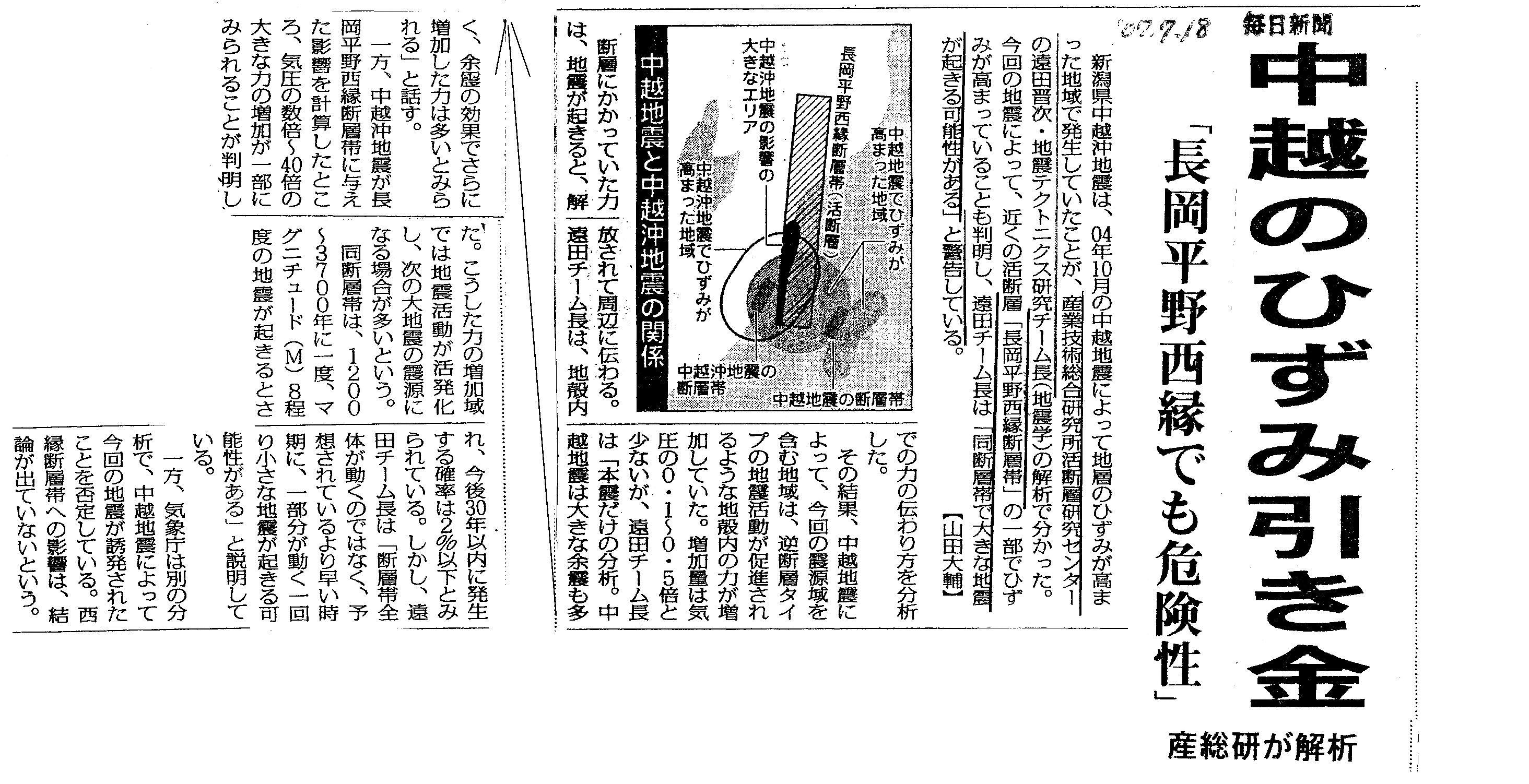 [2007_07_18_06]中越のひずみ引き金 「長岡平野西縁でも危険性」 産総研が解析(毎日新聞2007年7月18日)