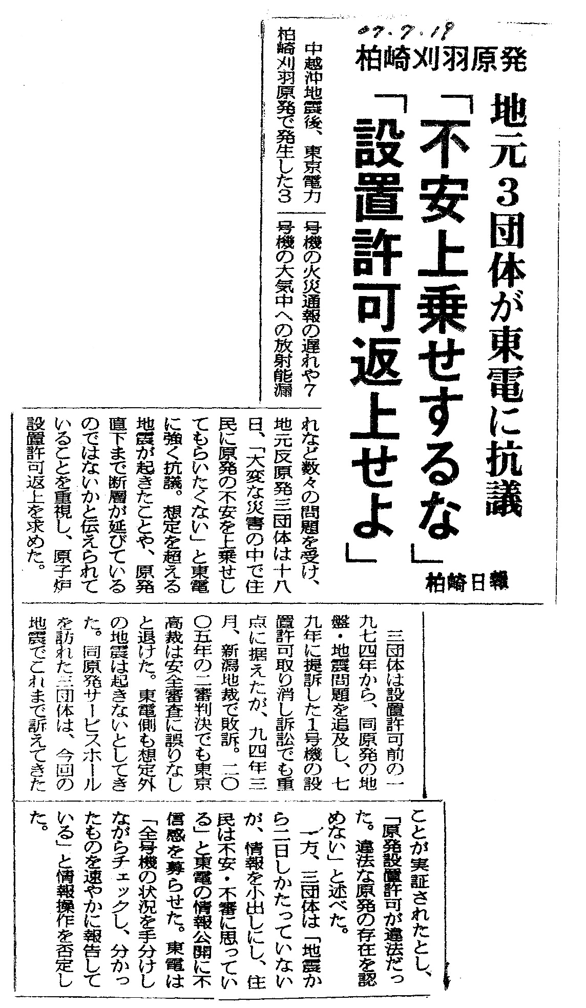 | [2007_07_19_05]柏崎刈羽原発 地元3団体が東電に抗議 「不安上乗せするな」 「設置許可返上せよ」(柏崎日報2007年7月19日) |