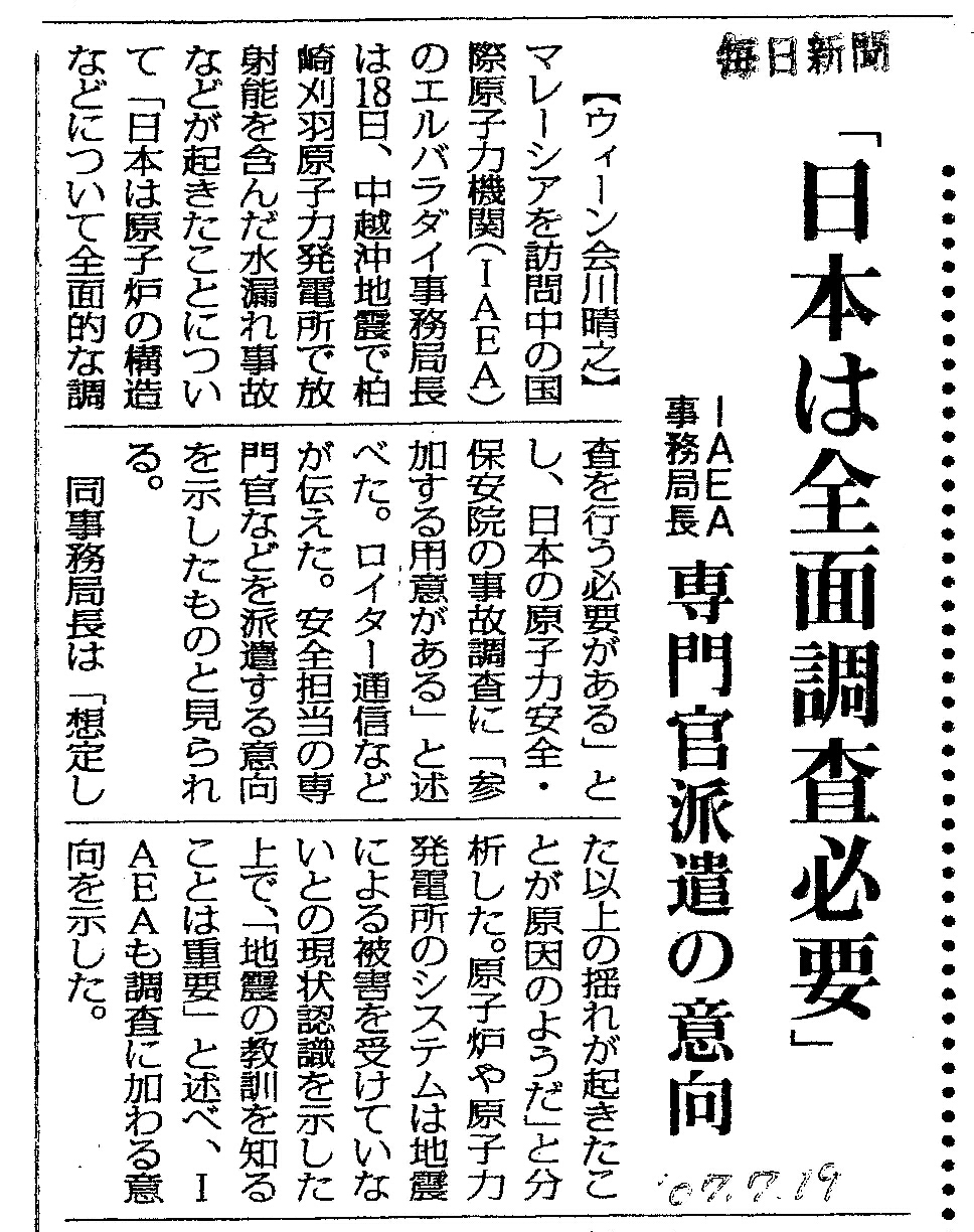 [2007_07_19_06]「日本は全面調査必要」 IAEA事務局 専門官派遣の意向 (毎日新聞2007年7月19日)