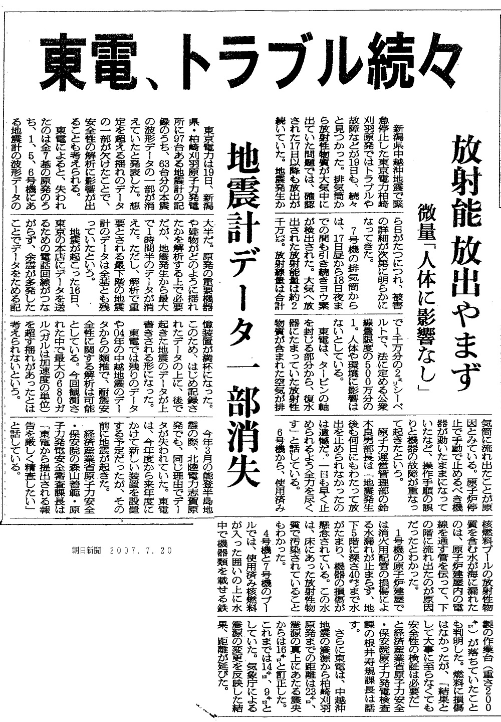| [2007_07_20_02]東電、トラブル続々 放射能放出やまず 微量「人体に影響なし」 地震計データ一部消失(朝日新聞2007年7月20日) |
