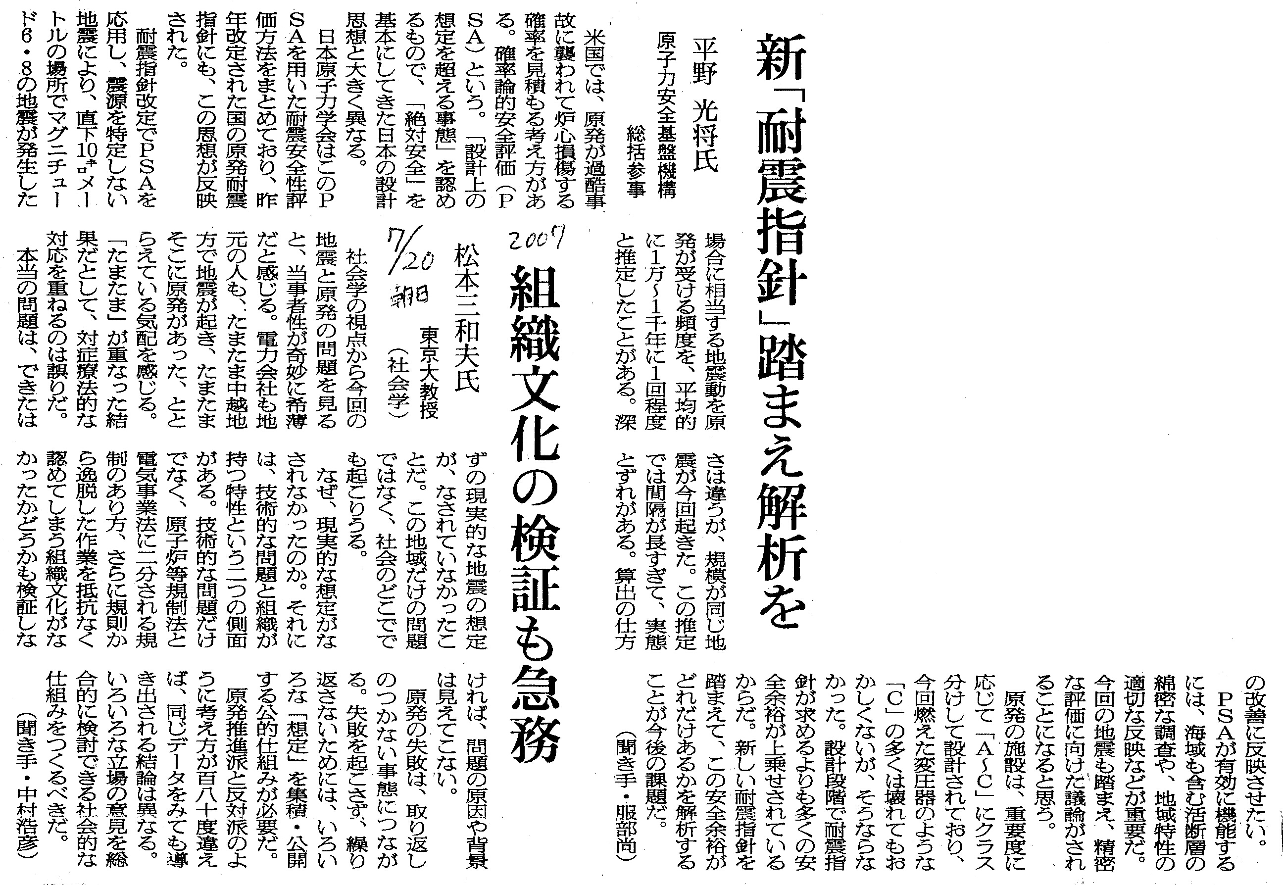 [2007_07_20_04]新「耐震指針」踏まえ解析を 平野三将氏 原子力安全基盤機構 総括参事 組織文化の検証も急務 松本三和夫氏 東京大教授(社会学)(朝日新聞2007年7月20日)