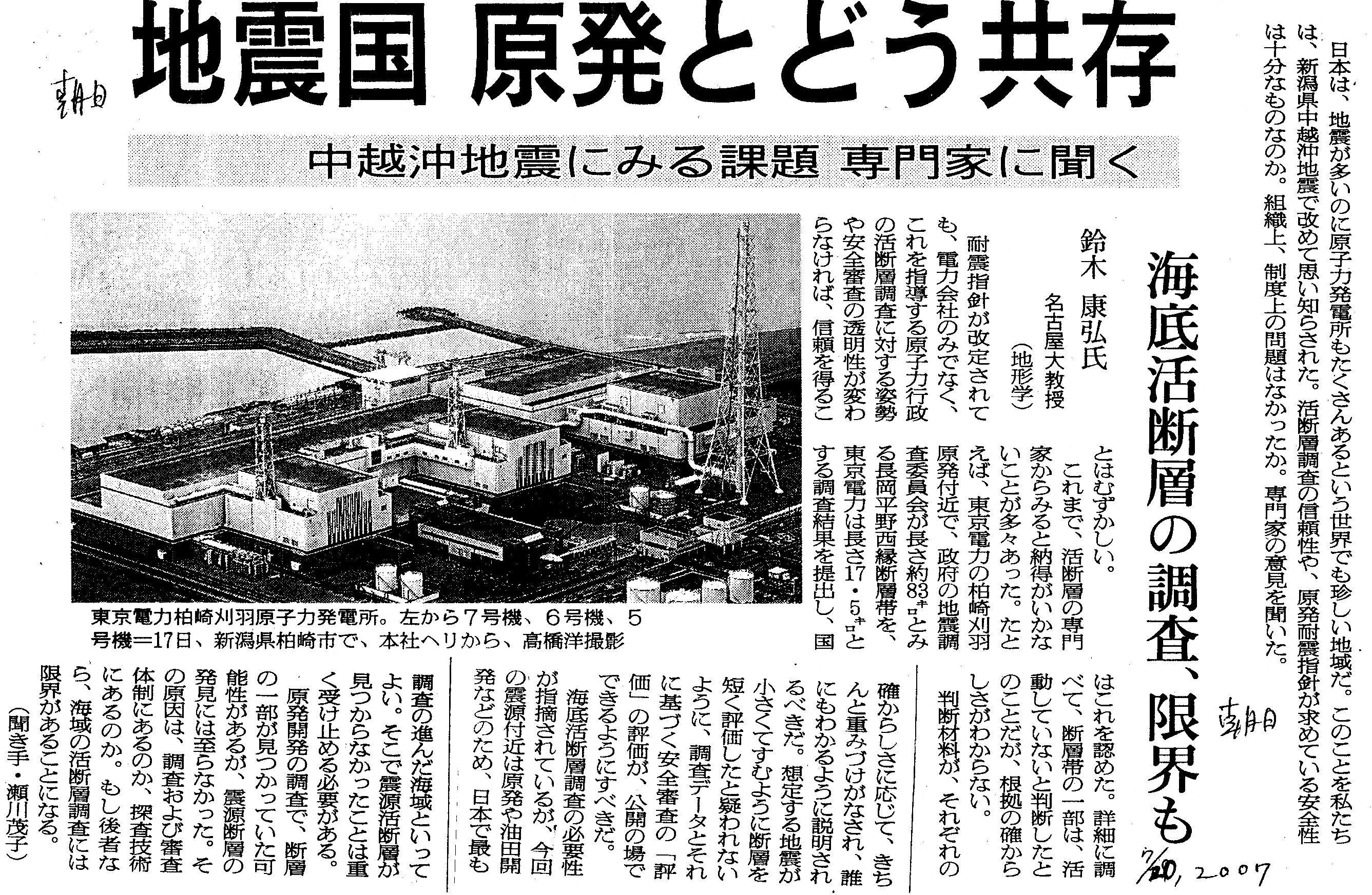 | [2007_07_20_05]地震国 原発とどう共存 中越沖地震にみる課題 専門家に聞く 海底活断層の調査、限界も 鈴木康弘氏 名古屋大教授(地形学)(朝日新聞2007年7月20日) |