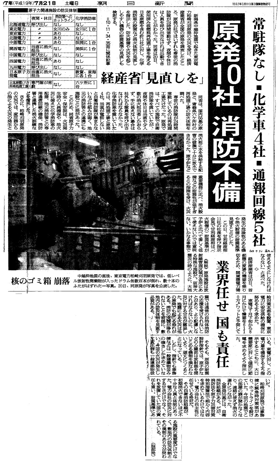 | [2007_07_21_02]常駐隊なし・化学車4社・通報回線5社 原発10社 消防不備 経産省「見直しを」 業界任せ 国も責任(朝日新聞2007年7月21日) |