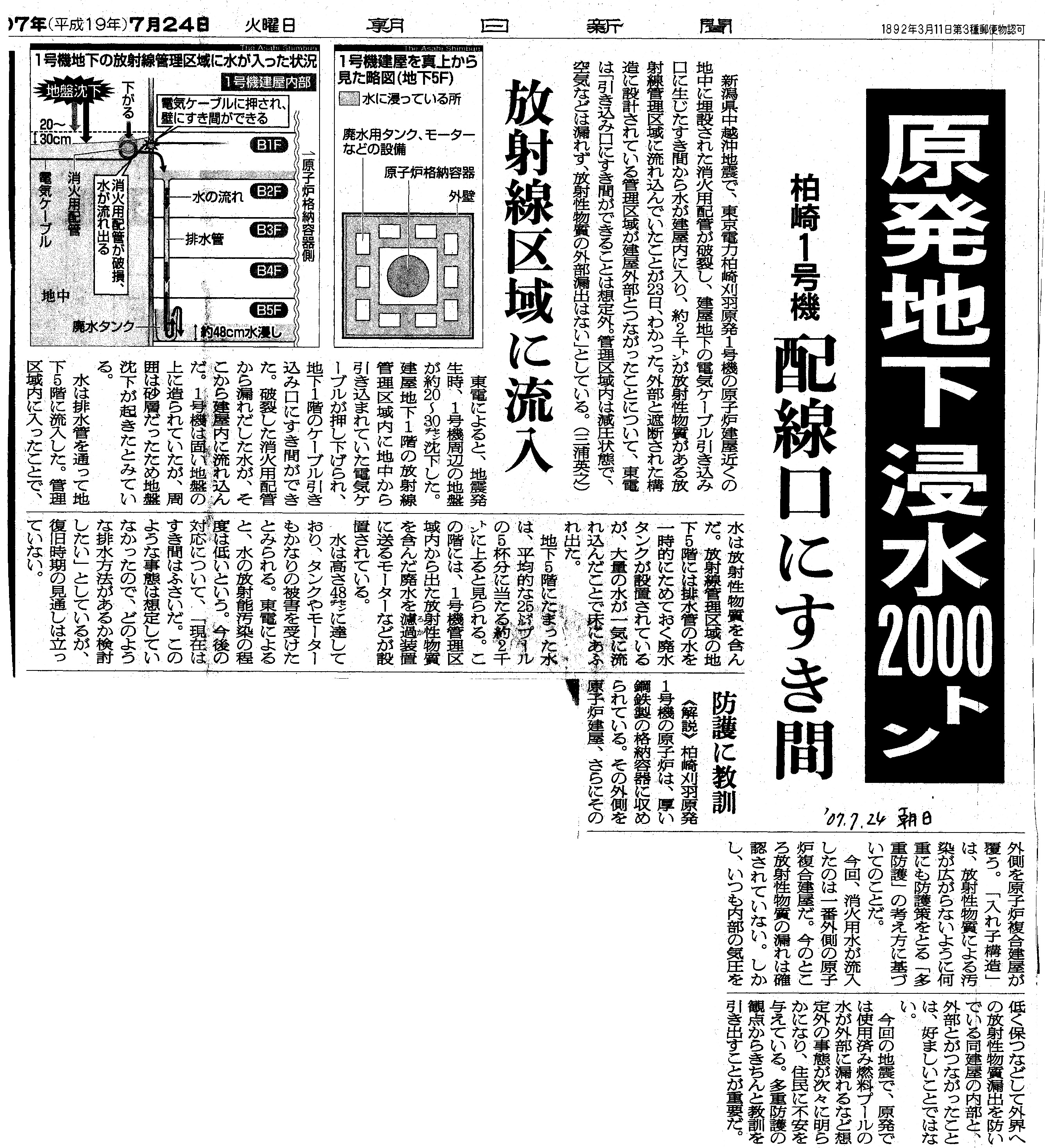 | [2007_07_24_01]原発地下浸水2000トン 柏崎1号機 配線口にすき間 放射線区域に流入 防護に教訓(朝日新聞2007年7月24日) |
