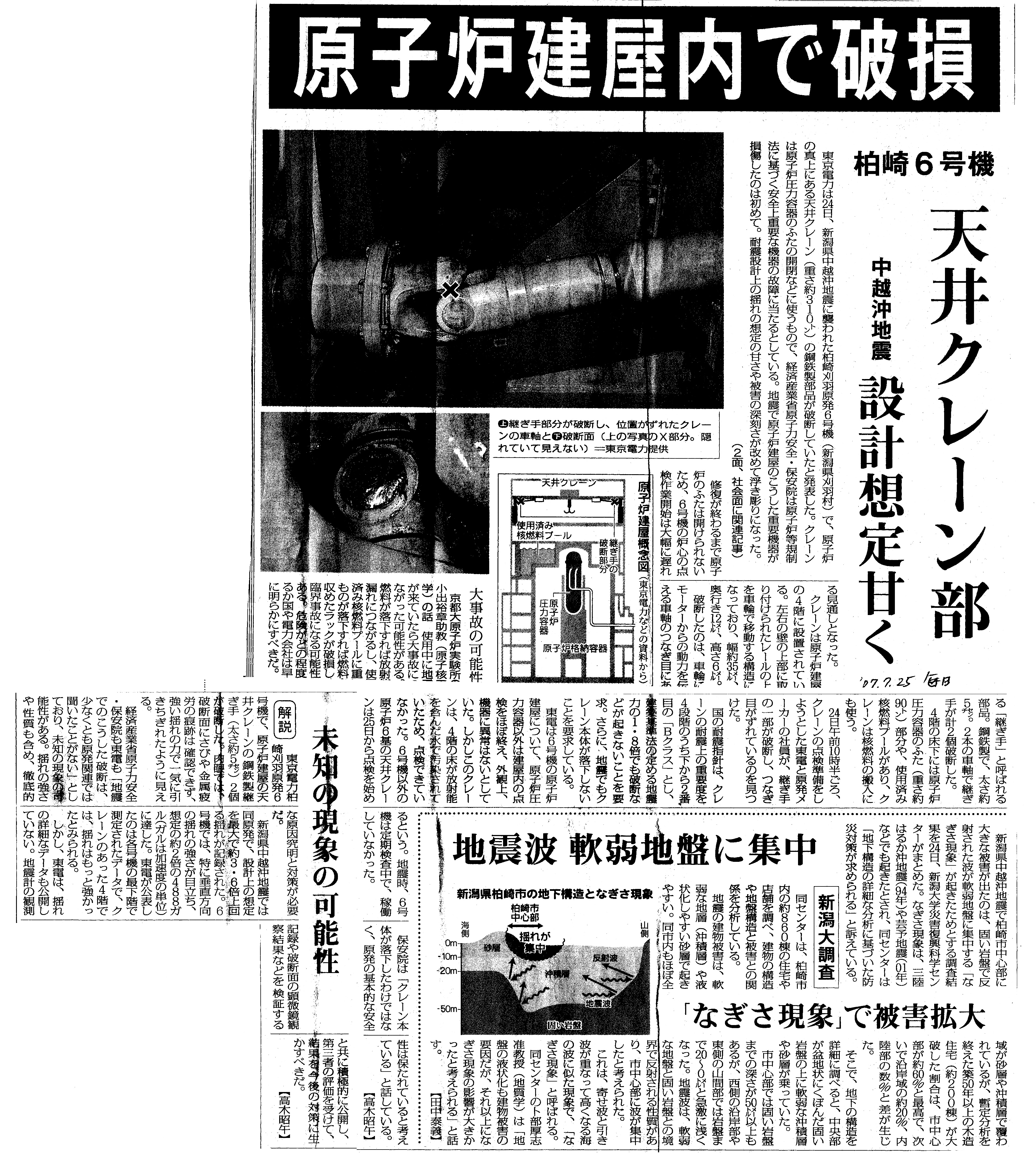 | [2007_07_25_02]原子炉建屋内で破損 柏崎6号機 天井クレーン部 中越沖地震 設計想定甘く 未知の現象の可能性 地震波 軟弱地盤に集中 新潟大調査 「なぎさ現象」で被害拡大(毎日新聞2007年7月25日) |