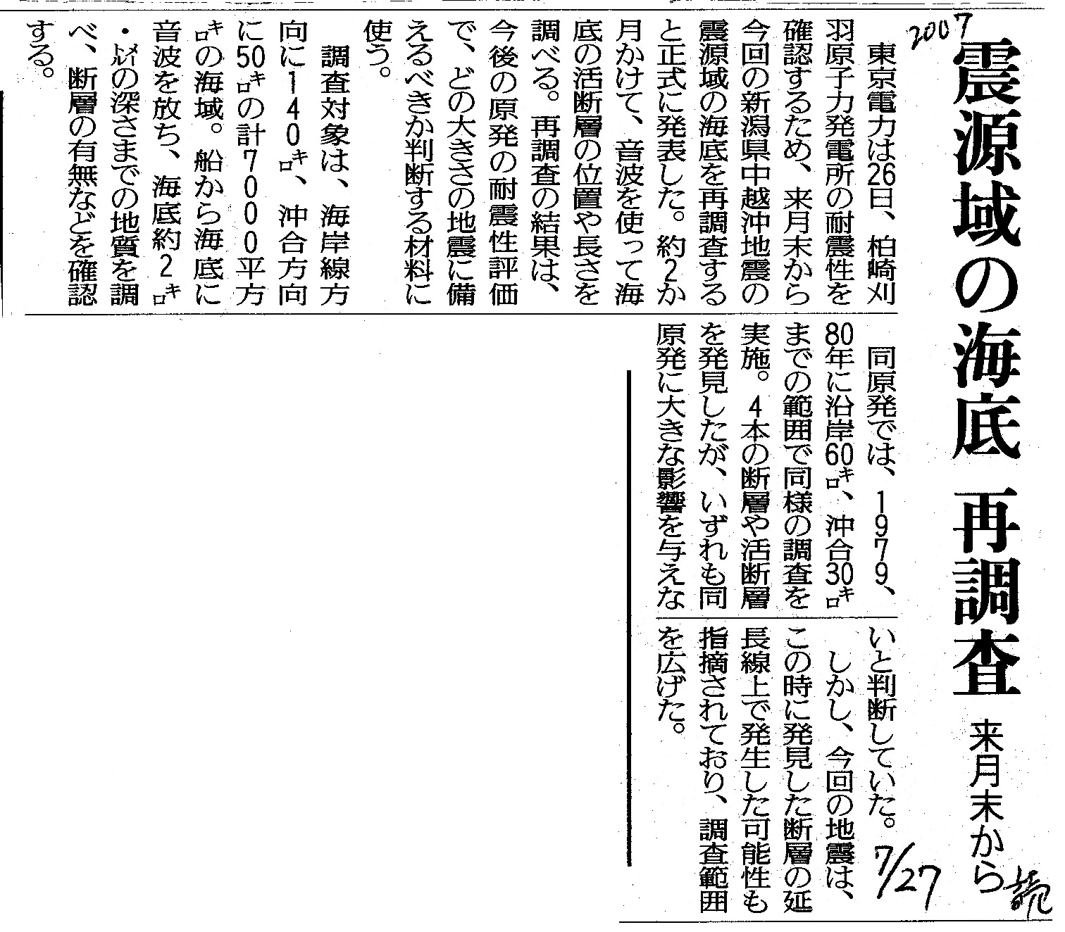 | [2007_07_27_01]震源域の海底 再調査 来月末から(読売新聞2007年7月27日) |