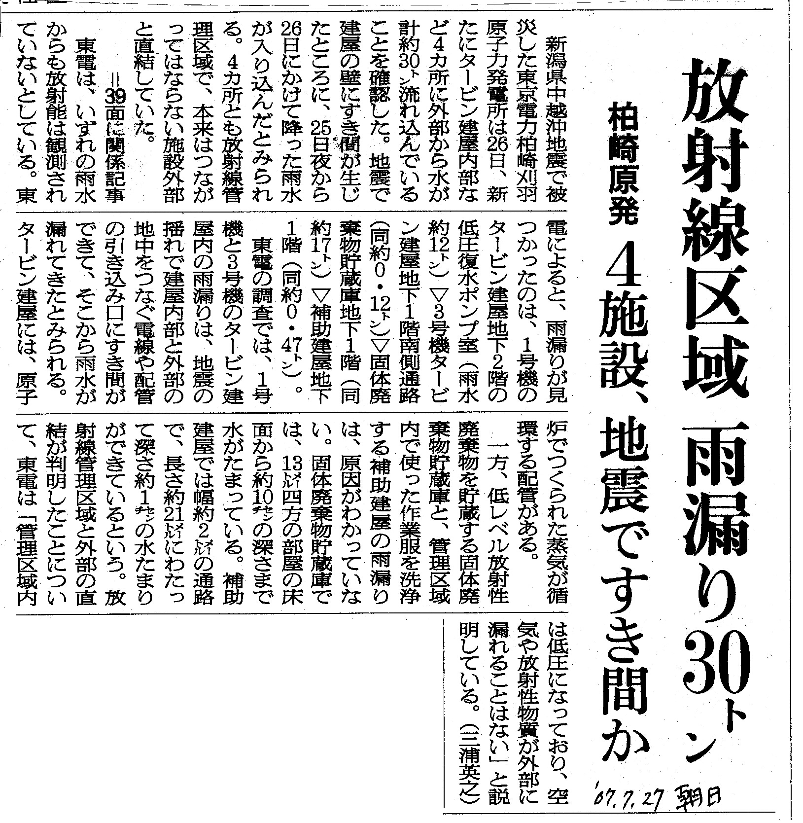 | [2007_07_27_02]放射性区域 雨漏り30トン 柏崎原発 4施設、地震ですき間か(朝日新聞2007年7月27日) |