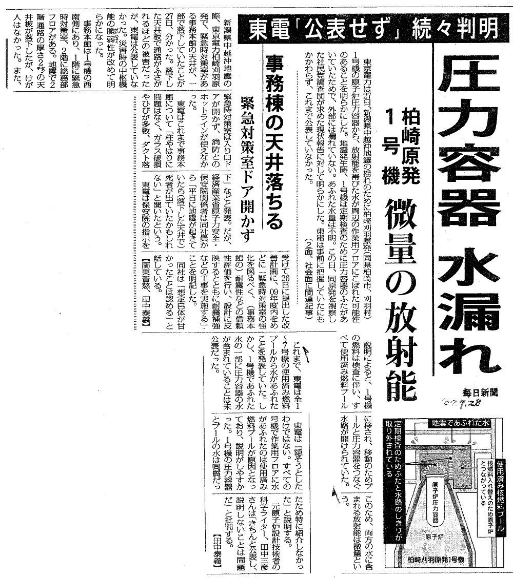 | [2007_07_28_01]東電「公表せず」続々判明 圧力容器 水漏れ 柏崎原発1号機 微量の放射能 事務棟の天井落ちる 緊急対策室ドア開かず(毎日新聞2007年7月28日) |