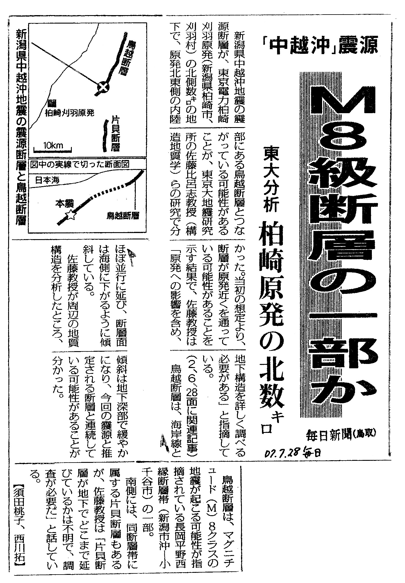 | [2007_07_28_03]「中越沖」震源 M8級断層の一部か 東大分析 柏崎原発の北数キロ(毎日新聞2007年7月28日) |