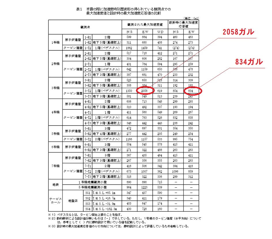 ※本図は「柏崎刈羽原子力発電所における平成19年新潟県中越沖地震時に取得された地震観測データの分析に係る報告(第一報)」の「表1_本震の際に加速度時刻歴波形の得られている観測点での最大加速度値と設計時の最大加速度応答値の比較」を抜粋したものである ※当会による修正・強調箇所は赤色で示した