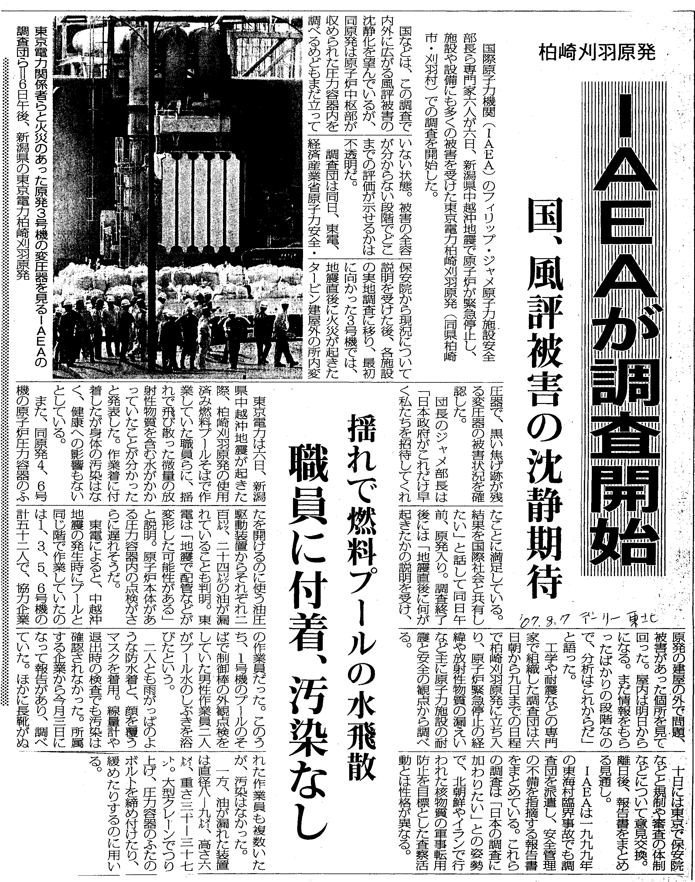 | [2007_08_07_02]柏崎刈羽原発 IAEAが調査開始 国、風評被害の沈黙期待 揺れで燃料プールの水飛散 職員に付着、汚染なし(デーリー東北2007年8月7日) |
