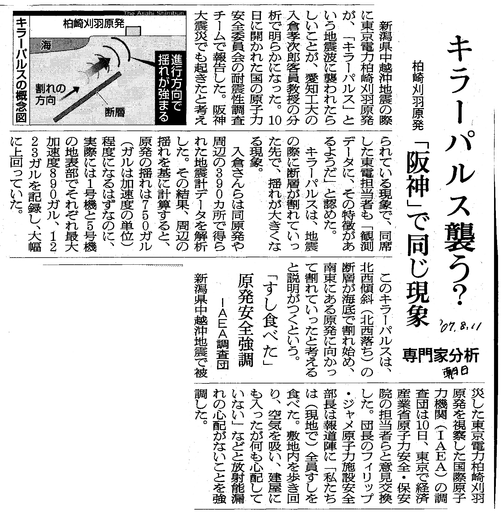 | [2007_08_11_01]キラーパルス襲う? 柏崎刈羽原発 「阪神」で同じ現象 専門家分析 「すし食べた」原発安全強調 IAEA調査団(朝日新聞2007年8月11日) |